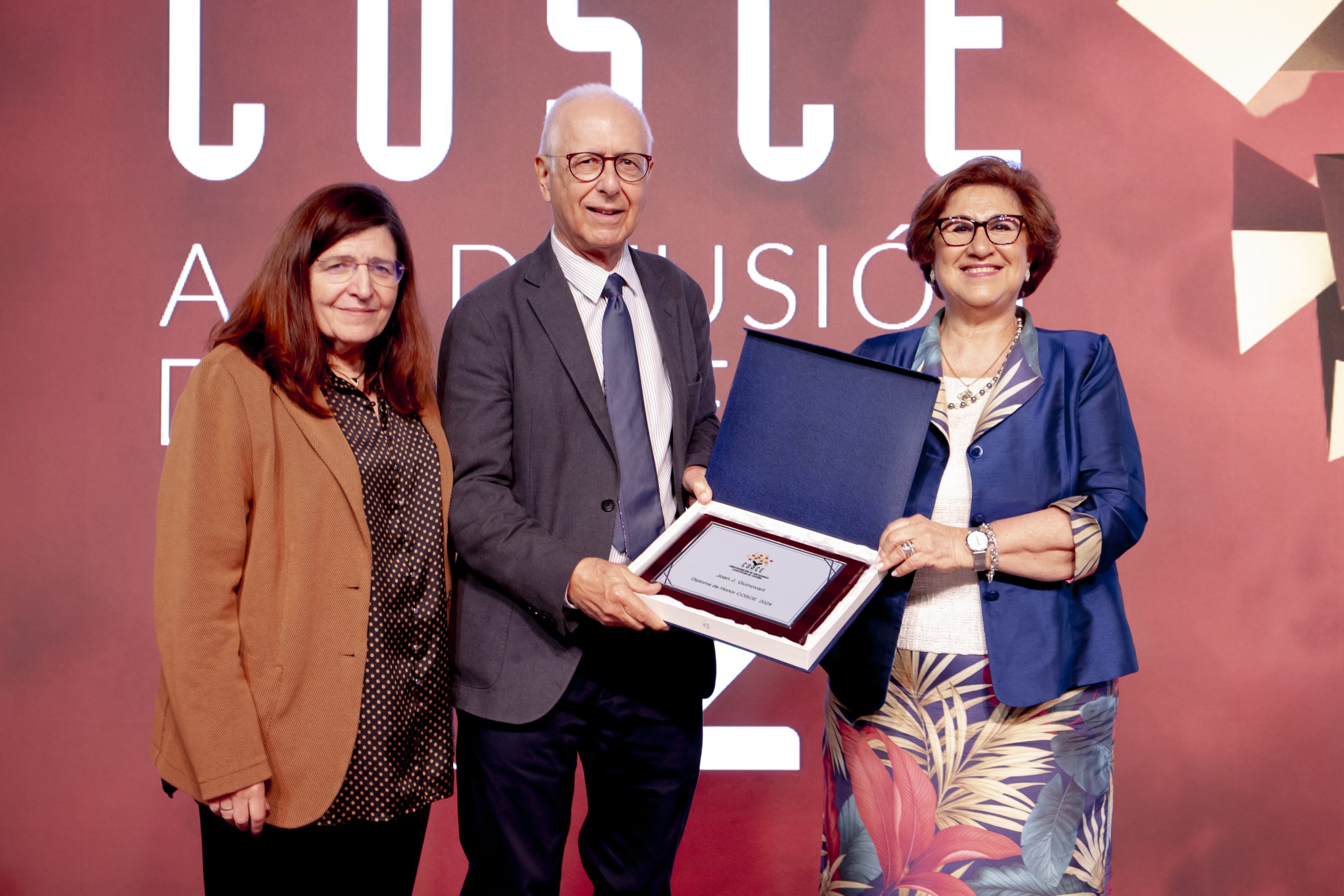Tras una semblanza de Joan J. Guinovart realizada por la vicepresidenta de la COSCE, Alicia Alonso, y en la que destacó la enorme importancia de la figura de Guinovart para la ciencia española en los diversos e importantes puestos que ha ocupado a lo largo de su trayectoria, la presidenta de COSCE, Perla Wahnón, hizo entrega del Diploma de Honor a Joan J. Guinovart.